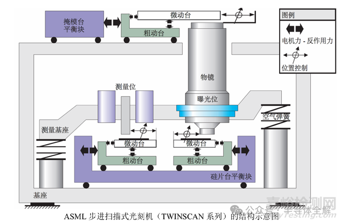 下圖為ASML步進掃描式光刻機(TWINSCAN系列)的結構示意圖,它主要由光學投影物鏡系統、工件臺系統和對準系統等組成。其中,工件臺系統包括掩模臺和硅片臺,是完成硅片曝光的關鍵子系統之一。