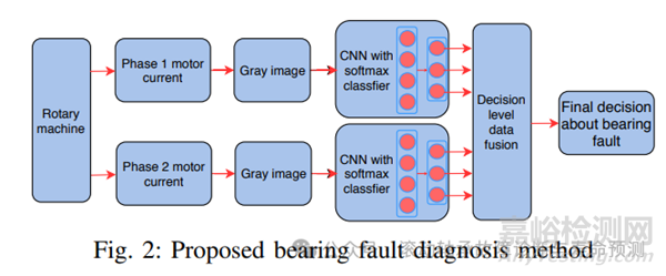 因此,本文提出了一種基于電機電流信號的故障診斷方法,該方法利用深度學習和信息融合技術,可應用于旋轉機械系統(tǒng)的外軸承故障診斷。該方法 ①采用來自電機電流的多個相位的原始信號作為直接輸入,從每個相位的電流信號中提取特征。②然后用卷積神經網絡對每個特征集進行分類。③為了提高分類精度,引入了一種新的決策級信息融合技術,將所有卷積神經網絡的信息融合在一起。④將決策級信息融合問題轉化為簡單的模式分類任務,通過熟悉的監(jiān)督學習算法即可有效解決。⑤通過對實際軸承故障信號的實驗,驗證了所提故障診斷方法的有效性。