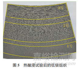 在斷口附近截取試樣,將試樣置于鹽酸水溶液中,加熱至70℃,腐蝕20 min,快速刷洗、吹干試樣后觀察其低倍組織,結(jié)果如圖5所示:彎頭外弧側(cè)1號(hào)區(qū)域組織較均勻,為等軸細(xì)晶區(qū);2 號(hào)區(qū)域組織粗大,存在枝晶偏析,為樹(shù)枝狀晶體組成的柱狀晶區(qū);靠近內(nèi)壁3 號(hào)區(qū)域存在大量環(huán)形疏松,越靠近內(nèi)表面組織越差;未發(fā)現(xiàn)白點(diǎn)、鼓包、微裂紋等氫損傷痕跡。