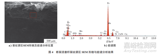 在裂紋源區截取試樣,將試樣置于掃描電子顯微鏡下觀察,并對其進行能譜分析,結果如圖4所示。由圖4可知:裂紋起源于活塞桿外表面,該區域斷口已被反復碾壓為平整光滑的斷面;裂紋源區的主要成分為金屬和金屬氧化物,無其他腐蝕產物及夾雜物。