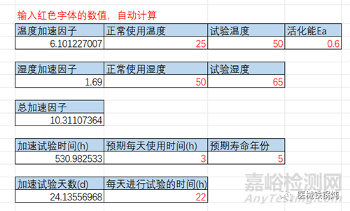 計算出來的AF為加速因子,例如計算出來AF=5,則代表在設定的高溫條件下測試1小時的相當于正常使用了5小時。