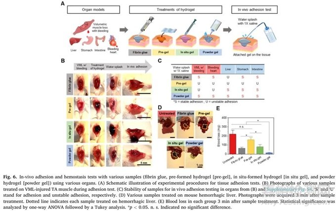 我們通過檢查dex-ald/明膠粉末水凝膠的組織粘連性、止血能力和可降解性來檢驗其作為組織粘連性水凝膠在體內應用的可行性。水凝膠的適當組織粘附對于提供受動態運動的組織(如骨骼肌)之間的可靠連接以及穩定地支持組織再生非常重要。我們研究了粉末(1:4)水凝膠和各種對照(預成型水凝膠、原位成型水凝膠和商業纖維蛋白膠)的體內組織粘附性,并比較了它們的特性(圖6)。注意,預成型和原位成型水凝膠與粉末水凝膠的組成相同。我們使用各種器官評估水凝膠樣品,包括出血器官(例如,VML損傷的出血性小鼠TA肌和出血性大鼠心臟)和非出血器官(大鼠肝臟、胃和腸)。每個水凝膠都受到水濺在器官上,以評估其附著力和穩定性。在VML損傷的出血性TA肌中,粉末水凝膠和纖維蛋白膠保持穩定,與損傷部位粘附良好(圖6B和C)。相比之下,在相同條件下,預形成和原位形成的水凝膠很容易脫落。特別是,預先形成的水凝膠不粘附在任何器官上。原位形成的水凝膠僅粘附在非出血器官上(圖6C)。結果表明,這些類型的水凝膠(預成型水凝膠和原位成型水凝膠)不適合治療無敷料或縫合的傷口。纖維蛋白膠穩定粘附在出血器官上;然而,它與肝臟的粘附不穩定,可能是因為它的表面光滑。相反,粉末水凝膠粘附在所有器官上,包括出血的VML和心臟。我們的粉末水凝膠具有優異的組織黏附性,這是因為干燥的dexald/明膠粉末可以吸收傷口的界面生物液體或血液,并有效地與組織相互作用。