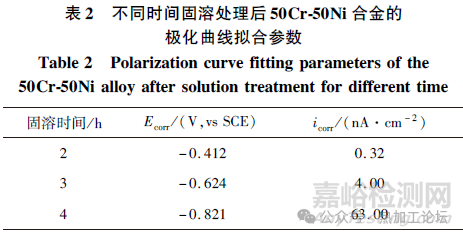 圖8為50Cr-50Ni合金經不同時間固溶處理后在3.5%NaCl溶液中的極化曲線。由圖8可知,外測電流密度隨電位的增加而減小,說明在陰極極化時,溶氧會向外擴散。試驗的最后,用電化學工作站自帶的擬合軟件進行分析,可以通過試驗數據得到本次試驗相對應的自腐蝕電位和自腐蝕電流密度,結果見表2。