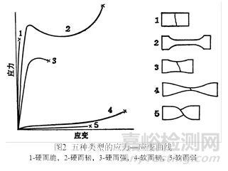 由于高分子材料的品種繁多,它們的應力—應變曲線呈現出復雜情況。若按在拉伸過程中屈服點的表現、伸長率大小及其斷裂情況,大致可以分為五種類型。它們是:(1)硬而脆,如聚苯乙烯、有機玻璃和酚醛樹脂;(2)硬而韌,如尼龍、聚碳酸酯;(3)硬而強,如不同配方的硬聚氯乙烯和聚苯乙烯的共混物;(4)軟而韌,如橡膠、增塑聚氯乙烯;(5)軟而弱,如柔軟的凝膠,很少用作材料來使用