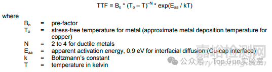 失效時(shí)間(TTF)可以使用埃林模型,在該模型中,計(jì)算機(jī)械應(yīng)力的冪律與阿倫尼烏斯因子的乘積。如果應(yīng)力是由不同的熱膨脹率產(chǎn)生的,那么這種應(yīng)力被稱為“熱機(jī)械應(yīng)力”,并且與溫度的變化(即熱應(yīng)變,ε ∝ (ΔT))成正比。
