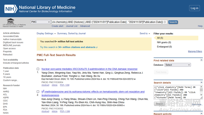 比如我想要搜索今年11月發表的與組蛋白和點擊化學有關的文獻,就可以用這樣的檢索策略,右側的Search details會顯示自動優化得到的檢索詞