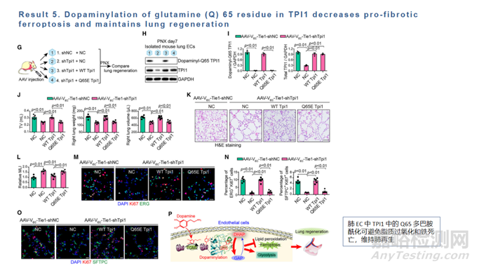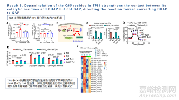 在機制層面,TPI1中谷氨酰胺(Q) 65位點的多巴胺化顯著增強了TPI1將二羥丙酮磷酸(DHAP)轉化為甘油醛3-磷酸(GAP)的活性,從而引導了再生肺內皮細胞中醚磷脂的合成路徑和葡萄糖代謝過程。該代謝改變有效降低了脂質過氧化并阻止了鐵死亡的發生。在損傷后的內皮微環境中,恢復TPI1 Q65位點的多巴胺化修飾可逆轉鐵死亡,恢復血管的促再生分泌功能,并有效緩解肺纖維化。總體而言,TPI1的多巴胺化平衡了脂質和葡萄糖代謝,抑制了再生肺內環境中促纖維化的鐵死亡。