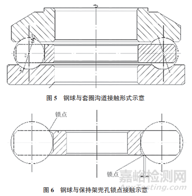 根據(jù)軸承幾何關(guān)系可知,正常情況下,軸承工作時鋼球僅與兩套圈溝道接觸,兩接觸點(diǎn)連線通過球心,引導(dǎo)鋼球定軸自轉(zhuǎn),同時在保持架的引導(dǎo)作用下,鋼球繞著軸承的軸線公轉(zhuǎn),鋼球始終在穩(wěn)定的軌道上運(yùn)轉(zhuǎn)(見圖5)。在某一時刻,鋼球移動到保持架鎖點(diǎn)極限位置時,相鄰兜孔保持架鎖點(diǎn)與鋼球之間有一定的間隙,鋼球與保持架兜孔不會產(chǎn)生接觸摩擦(見圖6)。