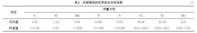 在開裂螺母上取樣,對試樣進行化學成分分析,結果如表1所示。由表1可知:試樣的碳元素含量不符合ASTM A480/A480M-23b 《不銹鋼和耐熱平板、薄板和帶材的一般要求》的要求。