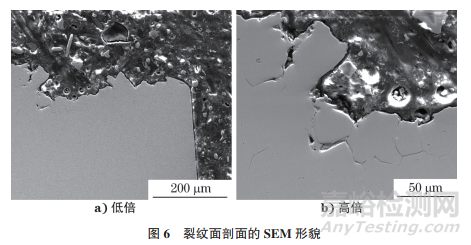 在裂紋面的剖面上截取試樣,將試樣經鑲嵌、磨拋后置于SEM下觀察,結果如圖6所示。由圖6可知:裂紋面上可見很多沿晶界擴展的二次裂紋,裂紋內可見致密異物。