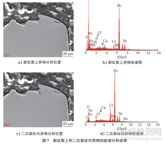 對裂紋面上和二次裂紋內的異物進行能譜分析,結果如圖7所示。由圖7可知:裂紋面上和二次裂紋內的異物中氧元素含量較高,且均存在較高含量的腐蝕性元素硫和氯,說明異物為含有硫元素和氯元素的腐蝕產物。