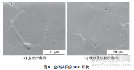 將金相試樣置于掃描電鏡下觀察,結果如圖8所示。由圖8可知:奧氏體晶界上可見點狀的析出相,部分晶界上可見連成線以及塊狀的析出相。