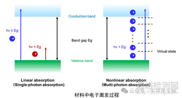 飛秒激光還具有超高的瞬時脈沖能量和高光子密度,可實現材料的非線性多光子吸收。下圖顯示了誘導電子激發的單光子和多光子吸收過程。
