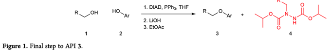 在生產API 3的最后一步中,醇試劑1以1.1摩爾當量與苯酚2的當量加入;因此,10%(100,000 ppm)被用作最壞情況的起始濃度4,用于清除評估。通過對清除的專家評估,表明沒有足夠的能力來確保4的濃度水平將被清除至低于可接受限度(表1)。在進一步評估預測因素后,根據pKa和水相pH值的原理,由于有機溶解度差,沒有考慮有機溶劑中4的洗滌。由于沒有可用的溶解度數據,通過使用HPLC測定的含量數據作為單元操作中4的清除系數(表2),在不到1天內收集了支持數據。