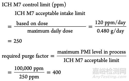 與所有清除方法一樣,API中的控制限制和所需的清除因子首先根據雜質的可接受攝入量、藥物劑量、ICH M7的治療持續時間以及該過程產生的最大PMI水平來定義: