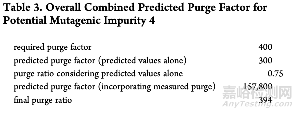 結合測量的清除量,對所需和預測的清除系數的比較表明,如表3所述,聯合預測清除量明顯大于所需清除量。根據綜合清除系數,如果4在反應結束時以高達10%的最大勢水平存在,則預測雜質水平不會大于0.63 ppm,這是基于TTC的250 ppm可接受限值的0.25%。根據包含測量的清除系數的清除計算,4的水平不會超過相關的TTC,并且不需要將PMI 4的測試包含在與ICH M7選項4控制策略一致的藥物物質規范中。