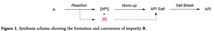 雜質B是一種ICH M7 2類(Ames陽性)化合物,在合成過程的最后一個化學鍵形成步驟中形成。在反應過程中形成后,雜質B在水處理過程中轉化為API(圖2)。
