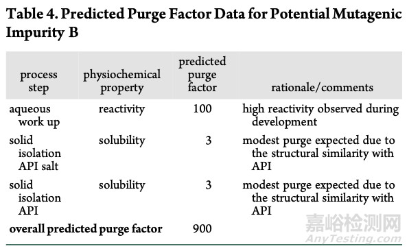 為了確定適當的控制策略,使用Teasdale框架將預測的清除系數計算為900(詳情見表4)。在整個設計空間中,反應過程中形成的雜質B最高水平為2%。考慮到這種雜質的可接受限值為170 ppm[根據B的既定每日允許暴露(PDE)和產品的每日劑量計算],所需的清除系數為118,相當于8的適度清除率,不足以證明ICH M7選項4控制策略是合理的,沒有任何進一步的支持數據。