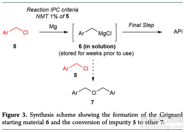 在生產最后階段格里納德反應的API(圖3)過程中,用于起始物料Grignard 6合成的原料苯基氯化物5被確定為2類(Ames陽性)化合物。氯化芐基5被轉化為原料藥,但起始原料6中存在的未反應5預計不會在最后一步發生反應。在生產起始物料6階段,通過反應完成過程檢查(IPC)將5的存在限制在NMT 1%。