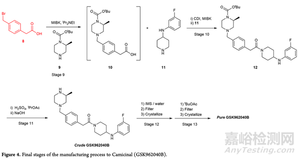 生產過程的最后階段涉及芐基溴化物8與過量(1.1摩爾當量)哌嗪9反應,產生羧酸10,羧酸10轉化為酰胺12。如圖4所述,以下酸介導的boc-deprotect揭示了Camicinal(GSK962040B)。