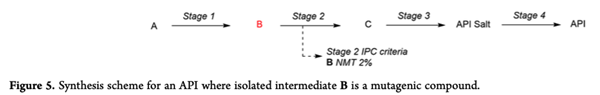 第1階段分離的中間體B是ICH M7第2類(Ames陽性)化合物。在其形成的下游,B在第2至第4階段轉化為原料藥,并被第2階段反應完成IPC限制在NMT 2%(圖5)。