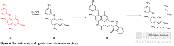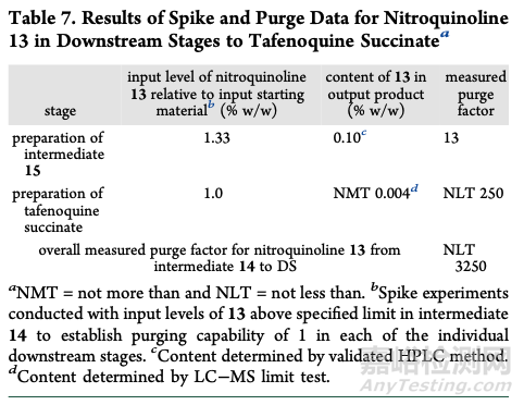 硝基喹哌13是合成抗瘧疾藥物物質琥珀酸他非喹的中間體,也是14中的潛在雜質,如圖6所示。硝基喹嘧嘧喹13是一種ICH M7第2類突變原,在中間體14中經常被該過程控制在1.15%以下。基于TTC的可接受限值是琥珀酸他非喹的400ppm,因此,13所需的清除量是中間體14中的29。