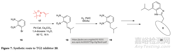 圖7顯示了可用于治療腹瀉的TG2抑制劑20的合成途徑。合成涉及烷基硼酸酯17,這是一種ICH M7 3類化合物。作為遺傳毒性雜質風險評估過程的一部分,對下游化學中硼酸酯17的清除進行了評估。使用17的輸入水平作為起始濃度,在沒有額外數據的情況下,預測到所需清除率不足以證明選項4的控制是合理的。盡管在16到18的預期轉換中已知17的反應性,預測18至19的還原性,以及通過溶解度在19至20之間的分離期間預測清除。因此,根據Barber等人描述的框架,尋求補充其他信息來補充這一預測的清除。