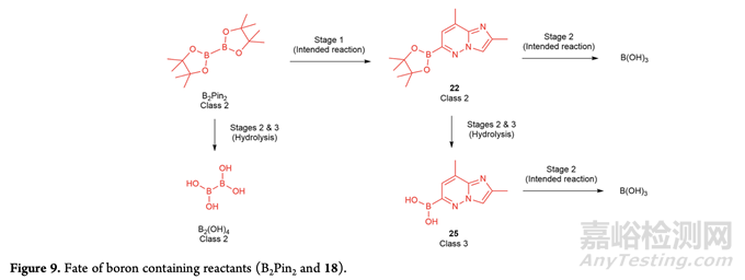 在第1階段和第2階段,發現了四種含有誘變性和潛在誘變性雜質的硼,即B2Pin2、ArBPin 22、B2(OH)4和ArB(OH)2 25(圖9)。