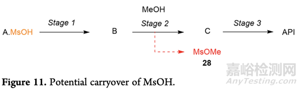 甲硫酸甲酯28是一種遺傳毒性雜質,當使用中間體A(胺的甲烷磺酸鹽)時,在第2階段通過殘留的甲硫酸和甲醇反應。在整個開發和圖11中。通過開發和商業化生產,作為藥物質量標準的一部分,對藥物物質中28的含量進行了測試(接受標準:<5 ppm)。所有批次的API測量水平始終低于5ppm。