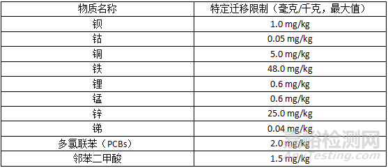 該標準為以下重金屬和化學物質設定了特定的遷移限制,包括: