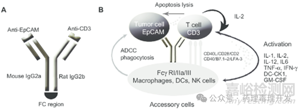 Catumaxomab是一款CD3-EpCAM雙抗,2009年被EMA批準(zhǔn)上市,通過腹膜內(nèi)給藥途徑,治療腫瘤相關(guān)的惡性腹水。嚴(yán)格意義上講,Catumaxomab應(yīng)該算是一個(gè)三抗。如下圖所示,Catumaxomab是由結(jié)合CD3的抗體、結(jié)合腫瘤抗原EpCAM的抗體以及結(jié)合Fc受體的恒定區(qū)組成,是具備Fc介導(dǎo)的ADCC、ADCP等效應(yīng)功能的多抗。相較于EpCAM單抗,Catumaxomab的活性強(qiáng)1000多倍。