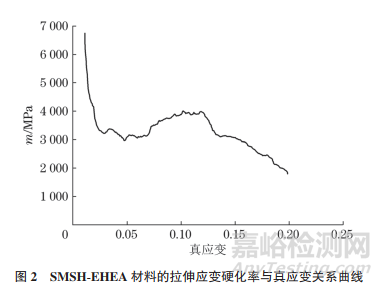 為確認T/CSTM 00514—2022標準計算拉伸應變硬化率的有效性,從文獻中采用人工描點的方式復制出拉伸原始數(shù)據,采用該標準有關拉伸應變硬化率的測定方法,結合“變帶寬移動回歸算法”得到了SMSH-EHEA材料的整個拉伸應變硬化率-真應變關系曲線,如圖2所示。