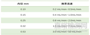 第六步:載氣流速選擇,載氣流速的選擇相對容易,可按最佳流速來設(shè)置,不同的內(nèi)徑色譜柱對應(yīng)不同的最佳載氣流速范圍,見下表: