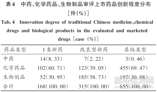 根據藥品注冊分類辦法,化學藥品、生物制品建立了創新、改良和仿制的基本分類體系,中藥按創新藥、改良型新藥、古代經典名方中藥復方制劑、同名同方藥等進行分類[4]。表明我國開始與發達國家的注冊分類方法接軌,既考慮了加快臨床為導向的創新需求,也考慮了以仿制為生存模式企業的需求,同時也注重中藥的傳承與發展,形成了符合中藥特點的注冊分類體系。本研究中根據CDE發布的技術審評報告中的注冊分類信息,考慮前后政策的銜接性,按1類新藥、改良型新藥、其他類型分類,區分藥品的創新程度。詳見表3。