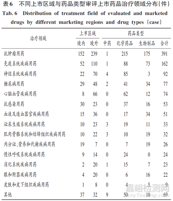從審評上市數量看,治療領域排名前5的依次為抗腫瘤用藥、免疫系統疾病用藥、神經系統疾病用藥、糖尿病用藥和心腦血管疾病用藥,這與我國當前疾病譜的變化密切相關[8];從藥品類型上看,中藥側重情緒、身體機能調節,化學藥品和生物制品的治療領域與當前疾病譜的發展變化聯系更密切。詳見表6。