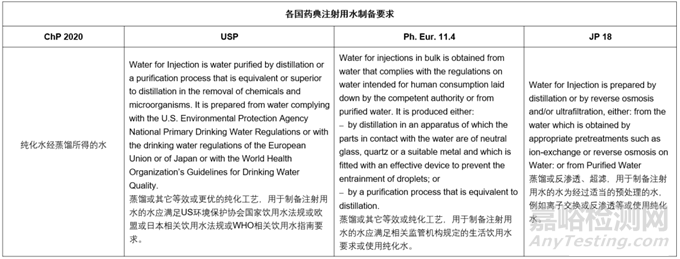中國藥典要求必須使用蒸餾的方式,而且原水為純化水;美國藥典、歐洲藥典、日本藥典中要求注射用水的制備方式為蒸餾或其它等效或者更優(yōu)方式,原水為符合相關(guān)法規(guī)要求的飲用水或純化水。
