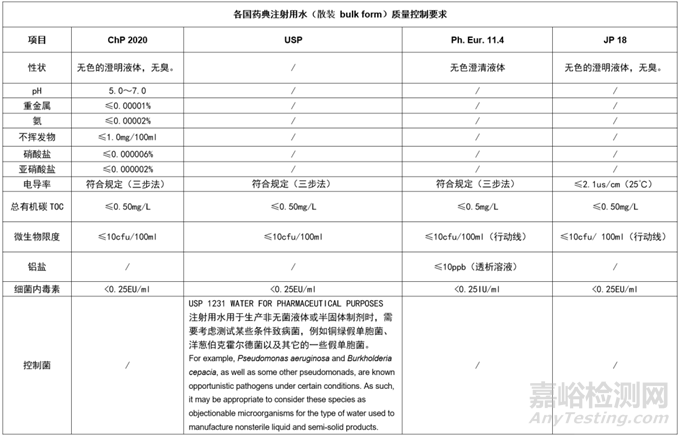 2.5 鋁鹽:歐洲藥典規(guī)定了當注射用水用于透析溶液制備時需要控制該項目,其它藥典對于該項目無要求。