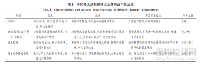 為滿足不同臨床需求和患者的個體差異,歐美國家批準上市了多種芬太尼類藥物劑型,包括注射劑、口服制劑、貼劑、離子電滲系統等;為防止流弊造成濫用,國內僅有注射劑和透皮貼劑被批準上市。不同芬太尼制劑特點和ADR見表1。