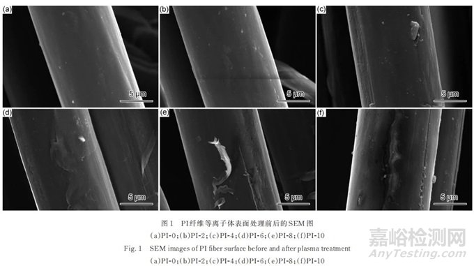 采用3342型材料試驗機測試等離子體處理前后PI纖維單絲拉伸強度,測量過程確保纖維方向與所受拉力一致。纖維斷裂時所記錄的讀數與單絲截面積的比值即為PI纖維單絲拉伸強度值。每組測試10個試樣,結果取其平均值。