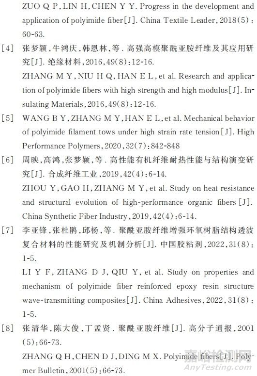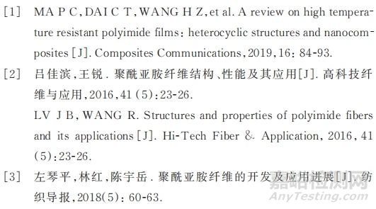 高強高模聚酰亞胺(PI)纖維具有突出的力學性能、耐高低溫、耐老化和低吸水、低介電、高絕緣等性能特點,是綜合性能優異、發展潛力突出的高性能有機纖維,能夠在航空航天及電力電子等領域發揮重要作用,是應用前景廣闊的關鍵材料[1-3]。與現有的高性能有機纖維相比,PI纖維能夠彌補超高分子量聚乙烯纖維耐熱性低、抗蠕變性差的缺點,不存在芳綸纖維吸水率高、熱變形程度大的問題,耐環境特別是耐紫外輻照性能優于PBO纖維[4-6]。國外發達國家自20世紀60年代開始研究,以美國杜邦公司和蘇聯的科研機構為主,但由于紡絲工藝路線問題一直沒有產品問世。20世紀80年代末,奧地利Lenzing公司推出的耐熱PI纖維P84,長期使用溫度為260 ℃,但其拉伸強度僅為0.5 GPa[7]。日本帝人公司也開展了PI纖維研發,PI纖維拉伸強度能夠達到2.2 GPa[8]。在該領域盡管國內研究及生產單位起步較晚,但技術進步較快且規模化發展迅速,江蘇先諾公司與北京化工大學聯合,實現高強高模PI纖維工業化,最高等級產品拉伸強度達到4.0 GPa[4,9]。