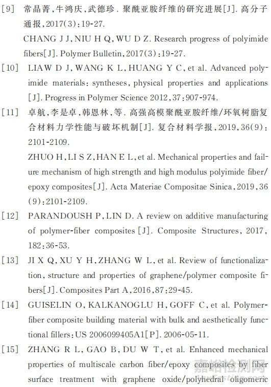 在擁有上述多項優勢的同時,PI纖維也存在有機纖維的共性問題。聚酰亞胺大分子鏈中交替分布著大量的由酰亞胺五元環和芳環構成的剛性共軛環狀結構,酰亞胺鍵連接的長直分子鏈段結構規整,具有高度穩定性,分子鏈間作用力強。上述結構特性使得PI纖維在具有較高強度和模量的同時,也導致PI纖維取向度高,分子鏈中極性基團向內反轉,纖維表面平整光滑,PI纖維整體表現為低表面能、高度疏水和化學惰性[10-11]。高性能纖維的主要應用方向之一是作為復合材料增強相使用。PI纖維的表面特性不利于樹脂基體的浸潤與復合。與樹脂固化制成復合材料后,PI纖維與樹脂基體間的界面結合效果也會受此影響,樹脂基體無法將作用力充分傳遞至增強纖維,進而導致纖維至復合材料性能轉化率低[12-14]。此外,PI纖維與一般有機纖維的形態結構類似,存在原纖排布構成的皮芯結構,纖維皮層及芯層的性能差異與結合狀態同樣會導致復合材料在受到層間剪切及橫向拉伸作用力時容易出現脫粘及剝離現象,為復合材料性能帶來不利影響。針對這一問題,當前主流的解決方法為纖維表面改性,大體可分為物理改性與化學改性[15-17]?;瘜W改性主要通過在纖維表面引入反應基團的方式提高其極性與反應活性,物理改性則使用等離子體、電暈、高能粒子束等手段對纖維表面進行重構,改善表面性能[18-20]。
