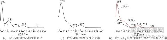 圖2為成分x和成分y的對照品的標準化光譜圖以及其解析分離后的標準化光譜圖,由解析分離后的標準化光譜圖與對照品的標準化光譜計算相似度,成分x相似度為0.998 220,成分y的相似度為0.998 267,均大于相似度閾值0.99。實驗結果表明重疊峰經過解析分離后,可以實現色譜峰的快速智能化識別。