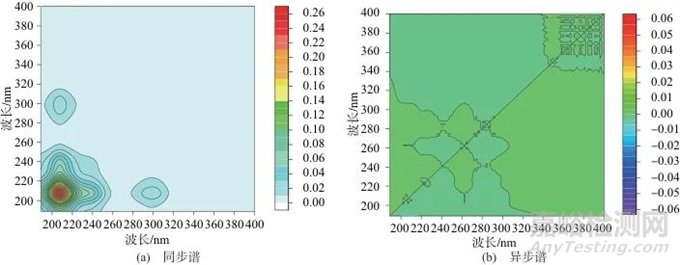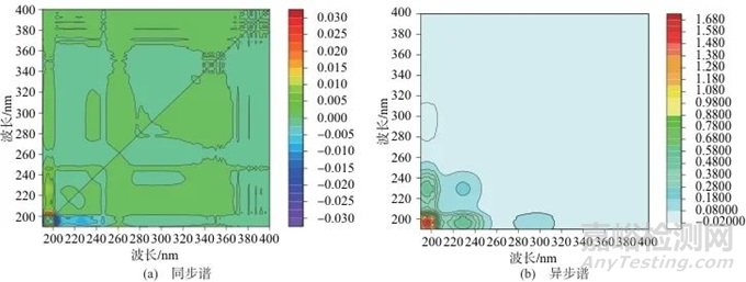 根據同步譜中交叉峰的正負和異步譜中交叉峰的有無提取特征光譜波長,見圖3。同步圖3(a)中包括自相關峰和交叉峰,對角線上的峰為自相關峰,對角線外的為交叉峰。對于對氨基苯酚同步二維相關譜,在主對角線197、230 nm處存在自相關峰,表明此波長處的紫外吸收峰強度隨外擾的變化而變化,在主對角線外側(197,230)、(197,295) nm處存在正交叉峰,表明3個紫外吸收峰強度隨外擾變化方向相同,其可能來自同一組分。對于2,4-二氨基苯氧基乙醇胺鹽酸鹽同步二維相關譜[見圖4(a)],在主對角線207 nm處存在自相關峰,表明此波長處的紫外吸收峰強度隨外擾的變化而變化。在主對角線外側(206,299) nm處存在正交叉峰,表明3個紫外吸收峰強度隨外擾變化方向相同,其可能來自同一組分,且為其特征吸收峰。同步和異步二維相關譜計算結果表明197、230、295和206、299 nm處紫外吸收峰分別為對氨基苯酚和2,4-二氨基苯氧基乙醇胺鹽酸鹽的特征波長。
