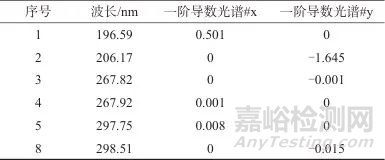 將采集時間內的時間t,波長λ的三維色譜光譜設為S(t,λ)三維數據,經過2.1的光譜預處理,對吸收光譜沿波長方向求導后得到導數光譜,以成分x導數光譜值為0的波長創建原點波長,所以波長λx的導數光譜色譜圖顯示僅含成分y的洗脫曲線、波長λy的導數光譜色譜圖顯示僅含成分x的洗脫曲線,也就是說可利用波長λx的導數光譜色譜圖僅分離y成分,同時可利用波長λy的導數光譜色譜圖僅分離x成分。因為在波長λy處成分x的導數光譜為負值,導致導數光譜色譜圖的峰值為負,所以需進行正負反轉。可獲得已去除該成分的色譜圖,同法創建成分y的原點波長,求取各導數光譜的原點波長,一階導數的原點檢測結果見表1。當存在多個原點波長時,選擇成分x和成分y的特征波長,且另一成分的強度絕對值大的波長,將成分x的導數光譜值的特征波長且是原點波長設為λx,成分y的導數光譜值的特征波長且是原點波長設為λy,實驗結果表明,成分x的原點波長為λx=196.59 nm,成分y的原點波長為λy=206.17 nm。
