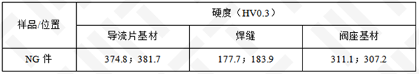 對(duì)失效樣進(jìn)行硬度測(cè)試,結(jié)果如表2。可知失效件導(dǎo)流片基材硬度較高,焊縫硬度低于基材硬度,焊縫屬于強(qiáng)度薄弱結(jié)構(gòu)。