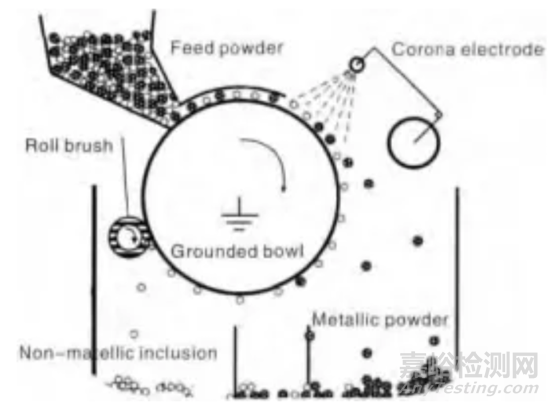電選分離技術是去除粉末中非金屬夾雜物的關鍵技術,其原理是通過電暈放電現象使粉末顆粒帶電,然后利用金屬粉末和非金屬夾雜物之間電性能的不同進行分離。圖6為高壓靜電分離原理的示意圖。