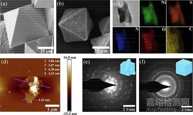 圖2. (a) Ni20-Cage、(b) Ni20-Cage-NS的SEM圖像;(c) Ni20-Cage-NS的TEM-EDS圖像;(d) Ni20-Cage-NS的AFM圖像和相應高度分布,顯示了單個薄片的測量尺寸;(e) Ni20-Cage、(f) Ni20-Cage-NS的SAED模式。