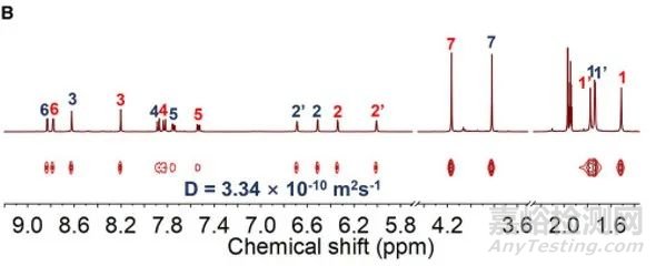 Zn-1(MII12L8, M=Zn)的1H核磁共振(NMR)信號在擴散有序光譜(DOSY)中表現出相同的擴散系數,表明流體動力學直徑為39.1Å(圖4)。這一直徑與金剛石光源單晶X射線衍射(XRD)分析得到的偽立方八面體籠Zn-1固態結構中的尺寸相吻合。