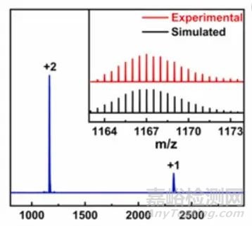 NUT-105在極性溶劑中表現出優異的溶解性,可通過高分辨率質譜法(HRMS)證實。HRMS是一種高效且直接的技術,能夠精確識別分離的MOCs分子量。如圖所示,在正離子模式下,在m/z為2330.9824和1165.9988處出現了兩個明顯的峰值,分別對應于[m-2Cl-]2+和[m-2Cl--H]+的信號峰值一致(M表示NUT-105的離散籠)。HRMS分析結果表明,NUT-105的籠結構由頂點的兩個三核鋯簇[Cp3Zr3(μ3-O)(μ2-OH)3]+和作為邊的三個去質子化配體組成。此外,兩種電荷狀態下孤立籠的實驗同位素模式與模擬同位素模式高度一致。