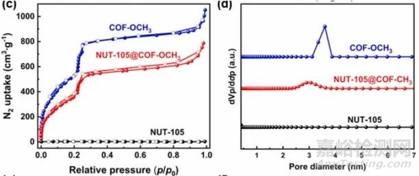 在77 K下通過N2吸附脫附等溫線對不同樣品的孔隙性進行了測試。NUT-105的N2吸附容量非常低,因為在活化過程中去除溶劑分子后會嚴重聚集,如圖9c所示。此外,通過非局部密度泛函理論(NLDFT)分析得到NUT-105的孔徑分布可以忽略不計(圖9d)。原始COF-OCH3樣品的Brunauer-Emmett-Teller(BET)表面積和孔體積分別為1560m2·g-1和1.60cm3·g-1,孔徑分布集中在3.3nm處。正如預期,COF-OCH3孔中NUT-105的存在導致總N2吸收能力顯著降低,BET表面積和孔體積分別為1050m2·g-1和1.22cm3·g-1,而孔徑分布在3.3nm處顯著減小。這表明NUT-105在COF-OCH3的孔隙中呈孤立分布。